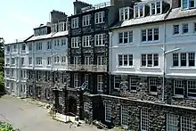 The Hotel has five storeys and a basement. The height of the Hotel was disguised by having the upper three floors included in a giant mansard with rows of dormers.[2] The Hotel reflects skilled craftsmanship, in the handling of materials and detail, that echoes Walton's earlier design for Wern Fawr (now Coleg Harlech).[1] Wern Fawr has been described as being "at the apex of building craft" and St David's Hotel has been described as Walton "at his most professional".[1] At St David's Hotel, Walton provided solutions to a challenging commercial design brief that included the traditional use of heavy masonry on the exterior of the Hotel, which was intended to reflect the use of this material in the locality.[1] In conjunction with this, Walton used reinforced concrete to open-up the interiors in order to simplify structural problems, make the most of the sea views, and give the interior "a cheerfulness which could survive even a dull Harlech day".[1]