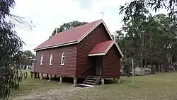 The church is a small single-stored timber building, rectangular in plan, set on low, circular sectioned concrete posts. It has a steeply pitched gable roof clad in short lengths of corrugated iron. The entry porch is located at the rear of the building and has a small steeply pitched gabled roof, accessed by recently added timber steps set into a steel staircase on the left-hand side of the entry porch. The building has three small lancet windows along both sides of the building.[1]
