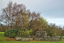The complex at St Doulagh's includes, in the field beyond the church and slightly nearer the road, a sunken stone enclosure. Within this is a low octagonal building, covering a spring, known as St Doulagh's Well. Outside the building is an open-air pool with stone seating, where pilgrims used to gather on November 17. The octagonal building is believed to have been a baptistry, the only surviving detached baptistry in Ireland, and the pool alongside may have been used for adult immersion.