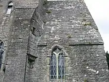 The eastern room on the ground floor of the medieval building is now called The Oratory. This is agreed to be the first element to be constructed and to have functioned as a church. It is aligned east–west and the altar according to church practice would have been at the eastern end. There are no architectural features that would suggest any screen that might have existed between a nave and a chancel. The principal window in the south wall of the Oratory has been dated by Harbison at 1230 AD. There is a taller window with a pointed arch behind the altar position on the east wall, possibly dating from the same time. There is a fragment of a piscina, for washing hands and vessels. A very narrow splayed window by the southeast corner, beside the altar position is said to have been a viewing hole for lepers, who were not allowed in the church. In the west wall of the Oratory is a hole said to have been used as a cure for ailments. In the west wall are evidence of blocked-up arches, said to have led at one stage to an aisle, now gone, which was built to accommodate congregation overflow. There is clear evidence of a blocked-up door in the south wall of the Oratory. There is a recess near the altar, possibly for vessels and other ceremonial items.