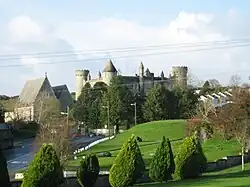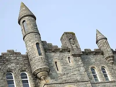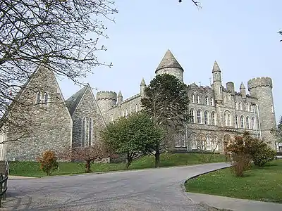 A three-storey edifice resembling a medieval keep, it has been called "the castle on the hill".[54] Architectural features include four turreted round towers and flying buttresses which are modelled on the nearby cathedral. There is a medial courtyard and a stone chapel. A habitat on the grounds comprises flora, fauna, and fungi, including a monkey puzzle tree on the front lawn.