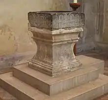 By the late 15th century, St Faith's Church was in a poor state of repair due to the decline in the population. The parishioners could not afford to repair it and requested permission to worship at St Cross Church in the Hospital instead.[1] The Master of St Cross agreed and in 1507 St Faith's was demolished, leaving just the graveyard, which continued to be used for burials and still belongs to St Cross. The font, bell and stone screens from St Faith's were moved to St Cross Church.[1][4] St Cross had had no need of a font prior to this as it had not been a parish church.[1][4] The stone screens are now on both sides of the sanctuary in St Cross Church.[5]