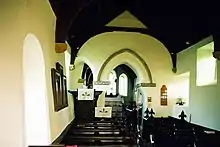The internal walls are largely rendered, with some ashlar detailing. The roofs have arch-braced collars on carved stone corbels, and the chancel's purlins use diagonal bracing.[3] The chancel arch has 12th-century origins but with later modifications including the rebuilding of the arch and the addition of an opening on the north side leading to the pulpit, probably carried out in the 17th-century.[4] The chancel's south wall has a 12th-century piscina in a 19th-century recess, and the sanctuary has paving using 19th-century encaustic tiles.[3]