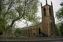 The church is built in stone with a slate roof. Its plan consists of a seven-bay nave with north and south aisles under one roof, a small single-bay chancel and a west tower. The tower is in three stages with corner buttresses rising to pinnacles.[2] The windows are thin lancet windows, containing Geometrical tracery. The east window consists of two pairs of lancet windows, each surmounted by a round window, with another round window above them.[4] The interior of the church has been divided. The arcades are carried on octagonal piers. The alabaster font is in the form of an angel holding a shell. The stained glass is by Lightfoot.[2] The three-manual organ was built by Renn & Wadsworth.[8]