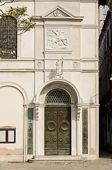 The current church building in the Campo San Vio was formerly the warehouse for the Venezia-Murano Glass and Mosaic Company. It was built to a design by engineer Luigi Marangoni, with sculptures by Napoleone Martinuzzi and dedicated in 1892.[2]