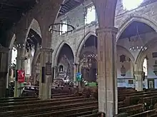 Around 1670, the church was refurbished, a gallery was built at the western end of the nave, and the carved reredos and a large wooden Royal coat of arms, now at the west end of the nave, were acquired at the same time.[10] An inspection report at the end of the 18th century commented on the dirty transept walls, and the need to install the equivalent of a cattle grid to keep pigs out of the churchyard. Rich crimson hangings in the church had earlier attracted the attention of a thief.[11] The increasing congregation led to the replacement of the pews and the construction of galleries down both sides of the building in 1829,[10] but a more extensive rebuilding was undertaken in 1878–80, by James Piers St Aubyn. The galleries were removed and the two outer aisles were added during this period, a chapel was converted to a vestry and improvements were made to the Hastings Chapel. The cost of these works has been estimated as between £16,000 and more than £18,000[6][10] (equivalent to £1,906,300 in 2021).[12] Later developments included the expenditure of £13,000 (equivalent to £239,900 in 2021)[12] between 1963 and 1968 to combat deathwatch beetles found during rewiring, improvements to the heating system, and a rededication in 1974, the quincentenary of the church.[10]