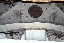 In 1868, frescos on the tower vault consisting of circular ornamental patterns surrounded by small rosettes were restored in black, russet and grey colouring. They are similar to those found in Stege Church on the island of Møn. Traces of similar decorations in the nave bearing the date 1522 were also found but they were not considered worthwhile preserving.[4] There is also a wall painting of St Agnes in a niche beside the font.<[5]