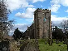 In the churchyard are three items that are listed at Grade II. To the east of the porch are two sandstone tombstones dating from the early and middle parts of the 18th century.[8] To the south of the tower is a badly worn sandstone chest tomb, dating possibly from the 17th century.[9] On the south side of the path leading to the church is a group of three sandstone tombstones dating from the middle of the 18th century.[10]