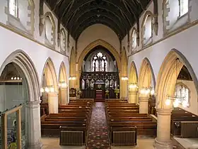 Nave, east towards chancel; aisles either side enclosed by arcades of four bays supporting the clerestory's and the wooden rafters of the roof. The north (left) octagonal columns are 14th century; the south round columns were added during the 1876 restoration