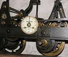 Part of the turret clock mechanism showing clockmaker as JB Joyce & Co of Whitchurch, Shropshire and date of manufacture of 1876