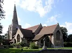 The building is mainly 14th century although the east wall of the chancel contains remnants of 12th-century material,[2] including two clamped buttresses.[nb 11][2] The ashlar-faced tower is 14th century with angled buttresses north and south.[3] The west window has three lights with flowing tracery.[23] The clock on the east face of the tower, dated 1876, is by JB Joyce & Co of Whitchurch, Shropshire, the oldest firm of tower clockmakers in the world;[24] it is wound weekly by the churchwardens.[25]