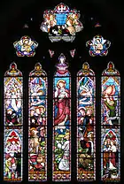 The east wall of the chancery has one window with five lights (stained glass panels) with tracery above in a Gothic style.[2] The church floodlighting is supported by funds from the National Lottery church floodlighting trust[nb 12]