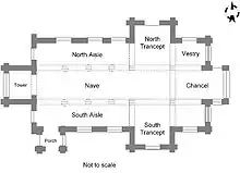 The church was restored very heavily in 1876[2] by the architect J. P. St Aubyn[1][5] at a cost of £4,400[14] (equivalent to £440,336[nb 4] in 2024). The north and south transepts were added at this time as well as the whole south aisle of the nave, the chancel, a clerestory and a new porch.[2]