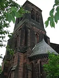 St James' is orientated north–south; in the following description ritual orientation is used. The church is built in red sandstone.[3] Its plan consists of a five-bay nave, north and south transepts, a chancel with a north chapel and a south vestry, and a west tower with a baptistry to the south. The tower is in three stages, with a west doorway, lancet windows, louvred bell openings, and a pyramidal roof. There are more lancet windows along the sides of the church, and a five lancets at the east end. In the roof are dormers.[2]