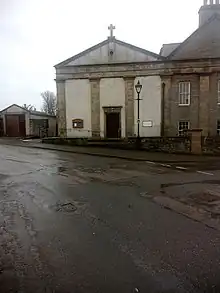 There was no significant Catholic congregation in Wick for centuries following the Scottish Reformation, until the early 19th century when the herring industry attracted seasonal workers from Ireland for six weeks in summer each year. In 1832, the Vicar Apostolic to Scotland's Northern Region, James Kyle, sent the Edinburgh-born Father Walter Lovi to minister to the migrant community. Lovi initially faced considerable hostility from the local population due to sectarian prejudice, and struggled to rent a space to hold Mass. However, his personal ministry to the sick during a cholera outbreak that year - and his role in persuading most of the Catholic labourers to remain in Wick throughout, saving the town from an economic disaster - won him a great deal of goodwill, and he was given vacant land on which to build a church. For the next four years, Lovi raised funds for the church's construction, which was completed in 1836; he left the town not long afterwards.[1][2] Continuing local anti-Catholicism necessitated the construction of large iron gates around the church, which were eventually removed in 1971.[3]