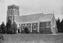 The first building to be built on the site was a small wooden church, which was built in 1875. On 23 June 1983, the wooden church was registered by the New Zealand Historic Places Trust as a Category 2 historic place, with the registration number being 1785.[3] The building was later moved across the road to its present day location for the construction of the current stone church. Meanwhile, the 1881 wooden church had become the parish hall, but since the 2010 Canterbury earthquake it has been used for services.