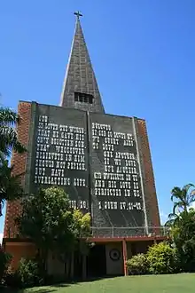 The church entrance is a simple, open, painted concrete portico. Above the portico the north elevation of the tower is treated to suggest an open bible with raised, white cement rendered letters two feet high on dark grey textured concrete pages reading:[1]