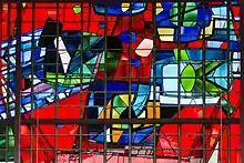 The church's roof is a hyperbolic paraboloid rising from two points on the ground to north and south. The roof structure is of concrete, covered with aluminium. The building has a hexagonal floor plan and concrete walls. The east wall is dominated by abstract stained glass designed by Keith New, who helped design the windows of Coventry Cathedral. The altar, font and pulpit, by Scorer, are of cast concrete.[3] The altar is raised on four steps in a circular sanctuary area to the eastern side of the hexagon. The font is placed in the central aisle, in front of the altar.