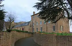 Originally, the site was intended to be a hospital; on the first stone, which was laid in September 1772, the engraving describes the building as "a general hospital, for the relief of the sick poor."[1] That foundation stone was laid by Frederick North, Lord North, the British Prime Minister at the time. In 1774, the building work stopped when funds ran out, and shortly after it was sold to recover the debts incurred from building it.[1] The building was eventually completed as a personal residence, and came into the hands of James Coles. Upon his death, the house, known as Taunton Lodge, was put up for sale. This was brought to the attention of a group of Franciscan nuns.[2] The nuns had left Bruges in Belgium, and arrived in England in 1794 to avoid persecution during the French Revolution. They initially settled in Winchester,[3] but the buildings they utilised there were not suitable for their permanent use, and in October 1806, they were ordered to look for somewhere else to establish themselves.[4]