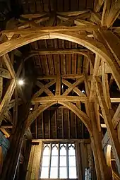 It is thought that the priory church originally had a high nave, with lower roofs over the aisles; in the late 14th century, one roof was erected over the nave and aisles. The dormer windows were built in the Tudor period, but it is not known if they predate the truncation of the church.[3]