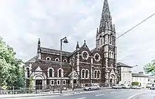 John Benson having died in 1874, William Henry Hill was the sole architect of the current church. Again designed in Romanesque style, this church took two years to build, and was consecrated on either 7[2] or 8 February 1889.[1] The church was de-consecrated in 2003 due to falling numbers of parishioners.[2] Built to seat 800 people, there were only thirteen parishioners in attendance at the last service held in the church.[2][3]