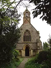 St Mary's is built of knapped flint, with Bath stone dressings and roofs covered with red tiles from Stoke-upon-Trent.[8] The internal stonework is of Bath and Caen stone ashlar.[7] The church is made up of a nave, chancel and north vestry with organ chamber.[7] The entrance is through a recessed door at the west end. Above is a bell-cot, featuring gablets and a foliated cross, containing a single bell.[8] It was cast from a piece of brass cannon captured at Sebastopol during the Crimean War (1853–1856).[4]