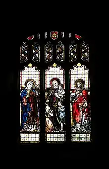 The stone pulpit and font are late Victorian; the only stained glass window is a 3-light west window from 1888 by Jane Nelson, in memory of her husband Matthew, depicting the Virtues of Faith, Charity and Hope.[1][2] There are two sets of Hannoverian coats of arms, one painted and one wooden.[1]