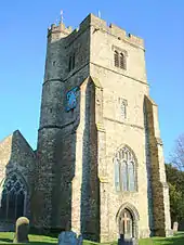 The church was built in several phases and is constructed of local rag-stone and flint with a plain-tiled pitched roof to each section. The tower, built of randomly coursed rag-stone, was constructed in the 15th century and comprises three stages with buttressed corners and a stair turret on the north-east corner. The tower parapet and turret are battlemented and a string course above the third stage belfry windows incorporates gargoyles. The west face of the tower features a large, three-lighted window above the west door.[1]