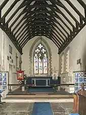 The nave and north aisle are separated by an arcade of four wide bays, three dating from the 14th century and one remodelled in the 15th century. The arches between the nave and chancel, the aisle and chapel, the nave and tower and the two-bay arcade between the chancel and chapel are all 15th century. The roof of the nave is scissor-braced. The roof of the aisle has king post trusses, with those in the eastern bay being chamfered and moulded. The roof of the vestry is trussed with crown posts and the chapel has a collar rafter roof. The 19th-century chancel roof has plain trusses.[1]