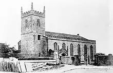 By 1826, the parish had a population of more than 5,000 souls and the medieval church was too small for a growing industrial town, so the body of the church was demolished and rebuilt, the new church adjoining the old tower.[6][7] A 13th-century pillar from the medieval church was saved from demolition and preserved in the vicarage garden.[8][9] The architect of this church is unknown, but surviving photos indicate it was a short, wide structure of six bays in the Georgian style.