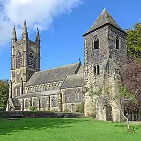 St Mary's Church is the parish church of the town of Mirfield in West Yorkshire, England. The current building is a large Gothic Revival structure designed by Sir George Gilbert Scott, replacing an older structure, the tower of which still survives a short distance from the present building. These structures form Mirfield's most prominent landmark and both are listed for preservation by Historic England, the old church tower as Grade II[1] and the present building as Grade II*.[2]