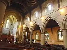 The interior is broad, high and light. The principal entrance in the south porch leads into the nave, formed of five bays. The arcade to the north and south aisles alternate between round piers with plain capitals and octagonal piers with foliated capitals; each arch has extensive moulding. Large arches into the chancel and into the tower. Vaulted ceiling to tower, ribs forming centre circle. Chancel of two bays internally, with black marble colonettes around central columns. Elaborate oak panelling to the left side of the chancel; sedilia and piscina to the right. East window lancets memorial to Ingram family, manufactured by Burlison and Grylls in 1882. The nave and chancel have a fine and elaborate arch-braced collar beam roof.[2][6][9]
