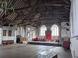 The north aisle is divided from the nave by a large timber arcade. This replaced the arcade destroyed by the collapse of the tower, and the polygonal timber posts stand on the 14th-century bases of the earlier arcade. The octagonal font is dated 1662, and its bowl is carved with quatrefoils. The 18th-century pulpit is polygonal, standing on a 19th-century base, and was formally part of a three-decker pulpit. The altarpiece is large and consists of a broken pediment on fluted pilasters. It was installed in 1756, and formerly held panels containing the Ten Commandments and the Creed that are now hanging on the north wall. Also on the wall of the church are the Royal Arms of Charles II dated 1660. In the aisle are 18th-century benches moved from Gopsall Hall in 1956. The altar in the aisle was formerly in St Mildred's Church, Canterbury, and the main altar dates from 1956. From the medieval period are niches, an aumbry, and floor tiles. In the north wall is a late-14th-century tomb recess. The memorials include a wall tablet dated 1606, and a wall monument dated 1808 by Westmacott. The stained glass dates from the 19th and 20th centuries. It includes 19th-century windows by Ward and Hughes, and windows in the north aisle dated 1933 by Morris & Co.[1]