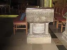 The interior had 12th-century wall paintings, a common feature of Sussex churches.[26] These do not survive, but illustrations of the scenes (which represented the Passion) exist.[7] One surviving feature from the 12th century is the square font of local marble, which now stands on a modern base but retains many original features including a carved fish design (unique in Sussex), arcades and tendril-style ornamentation.[1][4][6][7][10] A 15th-century altarpiece was removed from the church and installed in St Laurence's Church in Goring-by-Sea near Worthing when that church was built in the 1930s.[27]