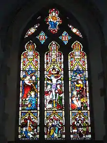 The east window of the chancel is an early-14th-century lancet with three trefoils. The exterior is hood-moulded. The north wall of the chancel also has a lancet window: this has quatrefoils and ogee headings.[4] The Covert Chapel has three windows, all with pointed-arched heads: that in the east wall has three cinquefoils (five-lobed lights), while the two in the south wall are simpler two-light windows.[4] The nave's north wall has one 19th-century window flanked by two dating from the 16th century and the blocked Norman doorway. All three are simple two-light windows with straight heads. Two windows in the south aisle also date from the Victorian restoration, as does the single window in the west wall.[4] Charles Eamer Kempe designed several stained glass windows for the church in the 1890s.[7]