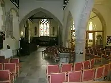 The tower rises in three stages, of which the lower two are local rubble and the upper (Victorian) part is of ashlar.[4] The horizontal divide can still be discerned.[12] Diagonally splayed buttresses were added at the northwest and southwest corners in the 15th century. Only the lowest and highest storey have windows. There is a single-light trefoiled lancet above the entrance and small round-arched windows in the side wall on the lowest storey; at the top the north wall has a clock and there are 19th-century lancets in the other three faces.[4] This section also holds a ring of eight bells hung for change ringing. There were originally five bells cast in 1773 by Thomas Janaway; two of these remain as the second and third of the present ring of eight, for which the other bells were cast in 1934 by Gillett & Johnston.[4][23] The tower is topped by a pyramid-style tiled roof.[4]