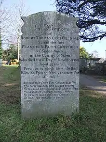 The churchyard also holds the burial of the medic Robert Thomas Crosfield: an alleged conspirator in the Popgun Plot against King George III.[6] The following is inscribed on his memorial –