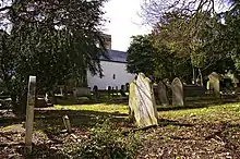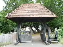 Entrance to the church is by way of the lychgate. It was first erected here in 1872, and rebuilt in 1991. It bears the legend ’Both High and Low, Rich and Poor together’. In the south west corner of the churchyard there is a young yew tree, taken as a cutting from the Eastling Yew in Kent, believed to have been alive at the time of Christ's birth. It was planted here in the year 2000 to mark the beginning of the third millennium of Christianity.[6]
