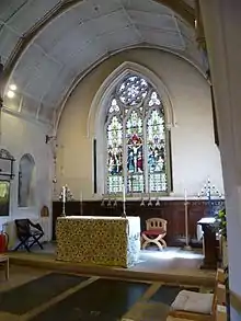 The chancel was extended in 1880.[4] It was lengthened by twelve feet incorporating a new east window celebrating the Annunciation of St Mary. This was presented by a churchwarden at a cost of £100. The choir stalls were doubled in length. The chancel roof was reshaped and the organ chamber was constructed as a transept. The present gallery was completed for the choir and it also housed a barrel organ which had been given by Sir Simon Haughton Clarke, 9th Baronet fifty years previously.[2]