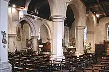 The embossed roof of the nave reflects the Tudor period with emblems of the crucifixion and the arms of Henry and Aragon (the lands passed to Henry VIII as a consequence of the English Reformation). Victorian restorers donated a number of windows, and more recent additions include windows to Saints Anselm and Nicholas. The Coronation window is in the north aisle above the Triptych painted by the pre-Raphaelite Edward Arthur Fellowes Prynne. His brother George Fellowes Prynne carved the Reredos with St Anselm and St George in the niches. Edward and George Prynne are both buried in the churchyard.[5][6]