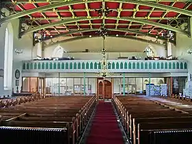 The roof of the nave is painted red and is divided into squares by ribs, at whose intersections are gilded bosses of different designs. The font is located halfway down the north side of the nave. It is Victorian and consists of an octagonal gabled and crocketted bowl on an octagonal column. The wooden pulpit is massive, measuring approximately 125 feet (38 m) from the base to the top.[9] To the east of the south door are churchwardens' box pews carved with Gothic details and poppyheads.[3] They bear a brass plate dated 1770.[10] In the nave are monuments to the memory of the Cliftons of Lytham Hall, including one to Thomas Clifton who died in 1688. A wall tablet commemorates Richard Bradkirk of Bryning Hall who died in 1813[3] and another monument is to Henry Rishton Buck, a lieutenant aged 27 who died at the Battle of Waterloo.[9] Behind the Lady Chapel altar is a folding reredos dated 1900 which was made by Kempe and moved from Christ Church Cathedral, Oxford.[9] The brass chandelier dated 1725 was made by Brown of Wigan.[10] The organ dates back to 1769 when it was built by Glyn Parker of Salford. Later modifications were made by R. W. Nicholson of Bradford (at an unrecorded date), by Harrison & Harrison in 1905, and by the Pendlebury Organ Company of Cleveleys in 1979.[14][15] There is a ring of eight bells which were cast by Charles & George Mears at the Whitechapel Bell Foundry in 1846.[16]