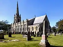The church is built in sandstone ashlar with slate roofs. Its plan consists of a six-bay nave without aisles, a three-bay chancel with aisles which are now used as vestries. To the north and south gabled porches project slightly from the second bays from west. The other bays have lancet windows between gabled buttresses. The nave is in Early English style and the chancel is in Decorated style.[3] The steeple is in Perpendicular style.[12] It has angle buttresses and is in four stages. The parapet is embattled and pinnacles rise from the corners. The octagonal spire is recessed and rises to a height of 150 feet (46 m). It is crocketed, has three tiers of two-light lucarnes and is supported by four flying buttresses.[3] The authors of the Buildings of England series consider it to be "perhaps the finest work of Edmund Sharpe".[10]