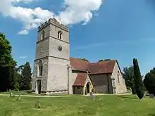 The present church nave dates from the 12th century, with the chancel and transepts from the 13th, and the tower from the 15th. The chancel was rebuilt in part, and the church restored, in the 19th century at which time a south porch was added.[1][5][6][7] A complete 1868 restoration was carried out at a cost of £2000.[8] Before the 1868 restoration the church was recorded as containing a north and a south aisle, and a tower of four bells;[9] and in 1818 as containing five bells.[10]