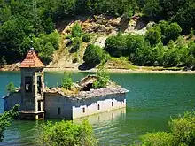 St Nicholas Church (Macedonian: Св. Никола Летен) is an abandoned church in Mavrovo, North Macedonia which is submerged in Mavrovo Lake. Built in 1850 with icons painted by Dicho Zograf, the church served as the main village church of Mavrovo. With the construction of the hydroelectric power station in Mavrovo and the artificial Mavrovo Lake, the church got submerged under water. During summer periods of drought, the church is accessible through land.[1]