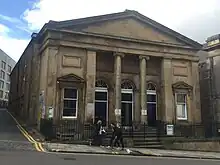 The Broughton Street building was constructed between 1843 and 1844 for a congregation of the Catholic Apostolic Church. The design is attributed to John Dick Peddie; if this is correct, it would be his earliest completed design. The building is in the Neoclassical style with a facade of five bays under an unadorned pediment. The three central bays are recessed and divided by Ionic pillars. The outer bays are framed by Doric pilasters. Each outer bay features an architraved window with a pediment on consoles below an architraved panel. The central bays feature three round-headed doors beneath a continuous architraved panel. The sides of them are faced in rubble while the rear incorporates a deep apse with three round-headed windows. Following its secularisation, the building was partitioned internally into three storeys with a basement.[54][55][56]