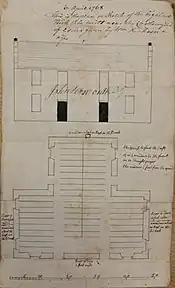 Plans submitted to the Dean of Guild's court show the Horse Wynd chapel as a simple Neoclassical building. The facade of five bays consisted of two storeys separated by a simple course of moulding. The walls were capped by a simple cornice and short attic storey while a pitched roof covered the building. The windows of the upper storey were rectangular while the openings on the ground floor (windows at the outer and central bays with doors in between) were segmental-arched. The central bay was slightly advanced with an advanced central panel in its attic sotrey. The plan shows the flank of the building as consisting of a simple wall of four bays and two storeys with segmental-arched windows. The chapel could seat 1,000 and the plans for the interior show with a bowed gallery.[52][53]