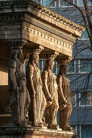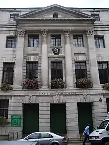 In the 1790s Earl Camden began to develop some fields to the north and west of the old church as Camden Town.[4] About the same time, a residential district was built to the south and east of the church, usually known as Somers Town. In 1822 the new church of St Pancras was dedicated as the parish church. The site was chosen on what was then called the New Road (now Euston Road) which had been built as London's first bypass, the M25 of its day. The two sites are about a kilometre apart. The new church is Grade I listed for its Greek Revival style; the old church was rebuilt in 1847. In the mid-19th century two major railway stations were built to the south of the Old Church, first King's Cross and later St Pancras. The new church is closer to Euston station.