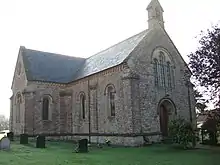 St Paul's is built of coursed and squared rubble, with a slate roof and bellcote, in a Neo-Norman style. The inside is made up of a two-bay nave, transepts and chancel with a vestry.[2]