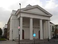 Designed by John Rebecca and built by Ambrose Cartwright, who also built nearby Ambrose Place, the building has a Doric portico with four columns facing Chapel Road, with a bell cupola behind it.[2] The building's yellow bricks are made from the blue clay taken from Worthing Common (also known as the Saltgrass), the green space which in the 19th century existed south of the current beach and is now underwater. The building is partly stuccoed.