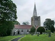 St Peter's is constructed in limestone with sandstone dressings and a red tiled roof.[2] At the crossing is a shingled spire, which rises to 110 feet (34 m).[4] The plan of the church is cruciform, and consists of a three-bay nave, a south porch, a steeple above the crossing, north and south transepts with extensions to the west forming single-bay aisles, a chancel, and a north vestry. Its architectural style is free Perpendicular. The south porch is gabled, and above the entrance is a niche containing a statue. The three straight-headed windows along the south side of the nave contain Perpendicular tracery. The west end of the church has large buttresses, a four-light window and a gable cross. Along the north side of the aisle are windows with three or four lights. On the southeast corner of the tower is a stair turret. The bell openings have two lights and are louvred. The parapet is coped and embattled. On top of the tower is a recessed spire with a weathercock. The transepts are buttressed, and contain three-light windows with Perpendicular tracery. The east side of the church has a five-light window with Perpendicular tracery, and a gable cross. On the north and south sides of the chancel are two-light straight-headed windows.[2]